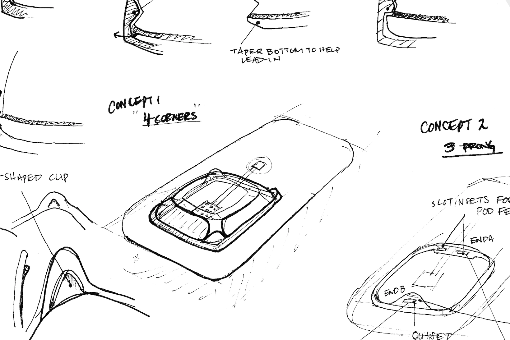 We started with an idea from a tech transfer patent using high resolution 3D printing (down selected), a micromolded platform (down selected), and finally proving the viability of a silicon etched array. I helped establish this tech through persistent research and discovery and contributed to the creative vision of the earliest form pod including a feasibility prototype to collect the first sensor data on humans.